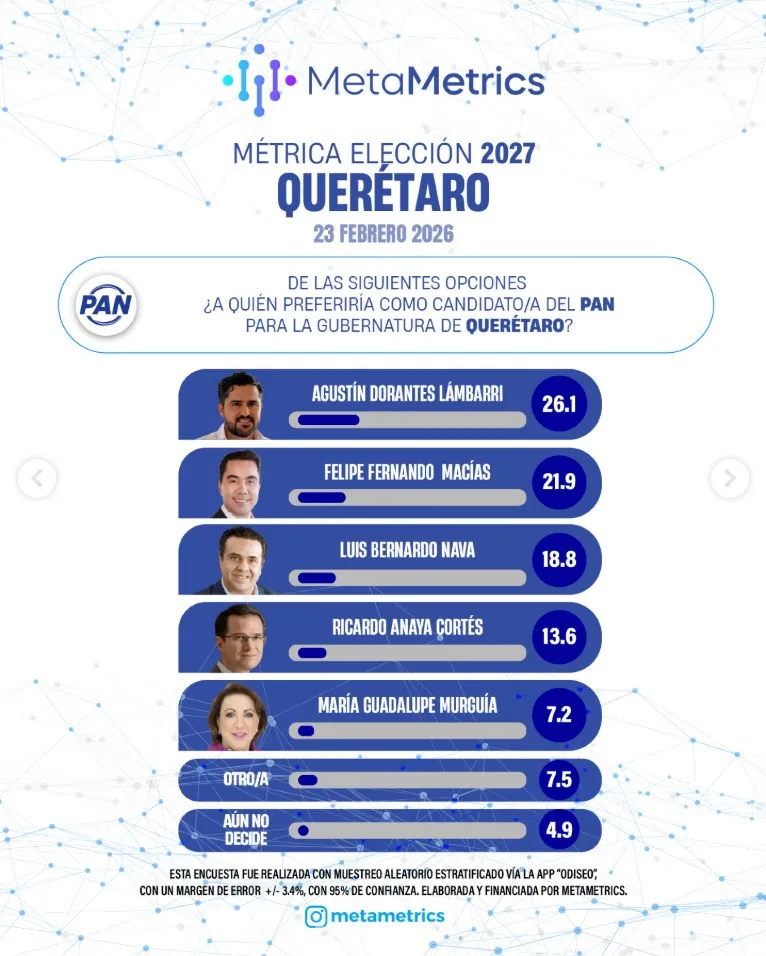 La más reciente medición interna del PAN en Querétaro, hecha por MetaMetrics, muestra que Agustín Dorantes Lámbarri es el aspirante mejor posicionado rumbo a la candidatura para la gubernatura de 2027.