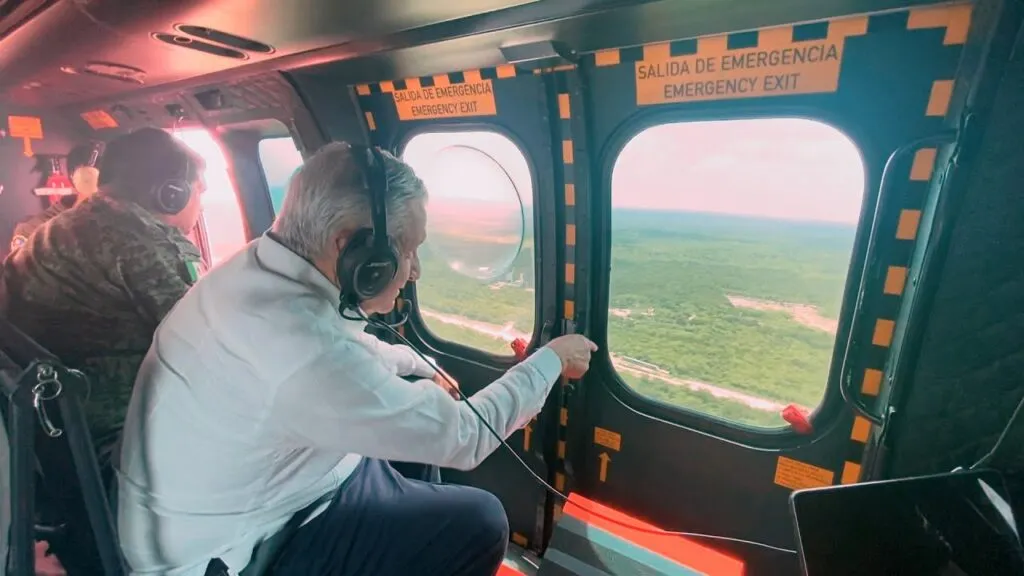 El presidente Andrés Manuel López Obrador continúa en el sureste del país supervisando la construcción del Tren Maya. Hoy sobrevoló el pueblo de Izamal en Yucatán.