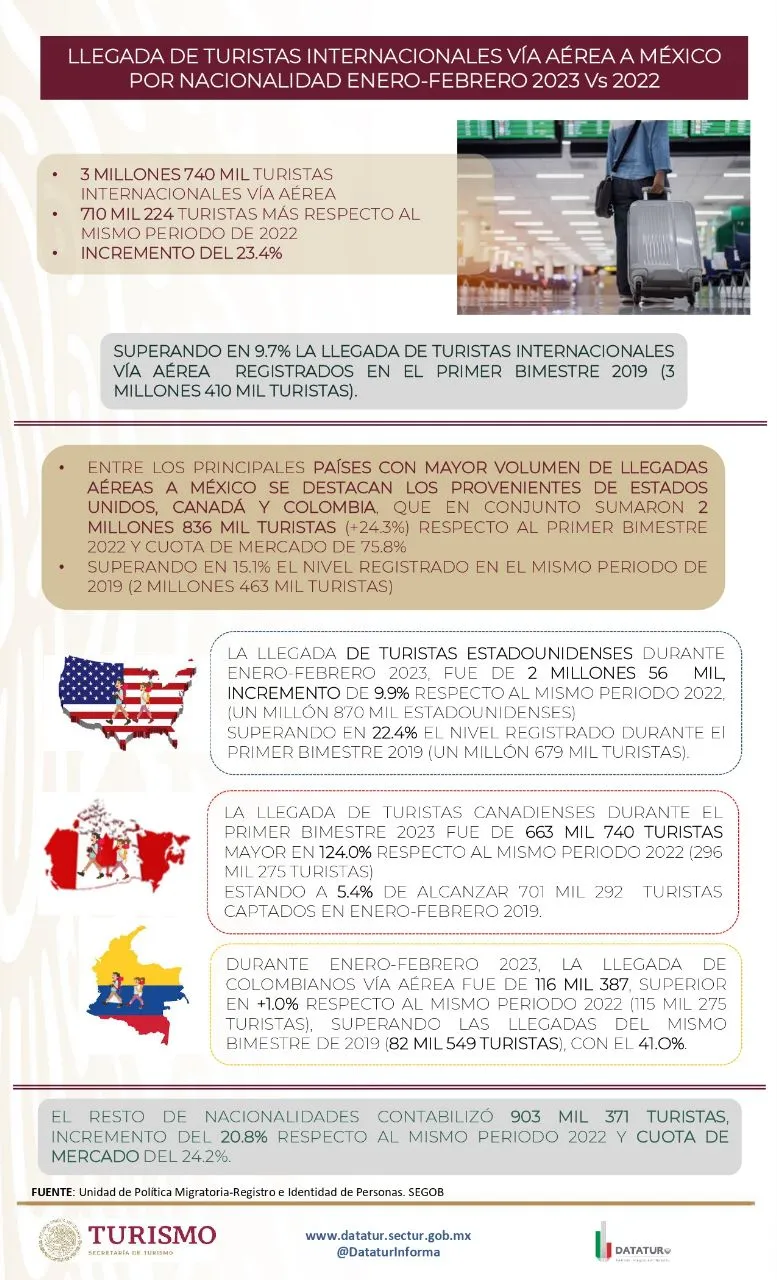 El secretario de Turismo del Gobierno de México, Miguel Torruco Marqués, dio a conocer que, durante enero-febrero de 2023, se registró la llegada de 3 millones 740 mil turistas internacionales vía aérea a nuestro país según su nacionalidad, lo que representa un incremento de 23.4% comparado con lo registrado en el mismo periodo de 2022.