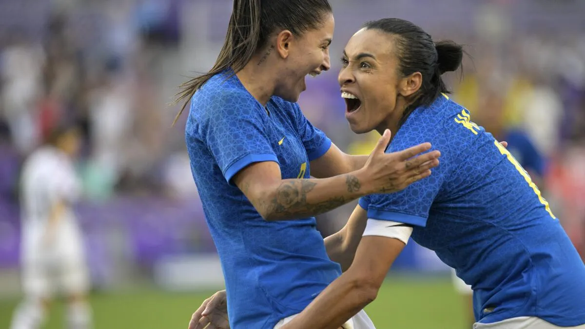 La delantera brasileña Debinha (izquierda) tras anotar un gol por la asistencia de Marta (derecha) en el partido contra Japón en la Copa SheBelieves, el jueves 16 de febrero de 2023, en Orlando, Florida. (AP Foto/Phelan M. Ebenhack)