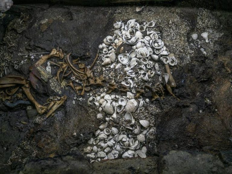 «Allí se ven perlas de piedra verde», dice Tomás Cruz, que trabaja en las excavaciones en medio de la mega metrópoli, y señala el suelo.