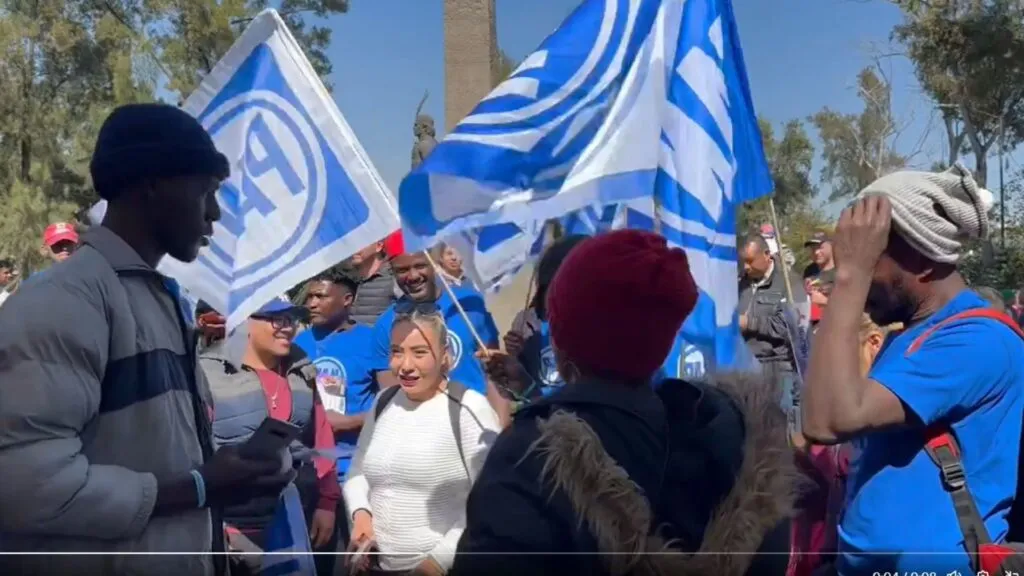 A través de videos en redes sociales se aprecia cómo las personas migrantes hondearon banderas del PAN al ritmo de tambores, de acuerdo con un video compartido por el periodista David Santiago.