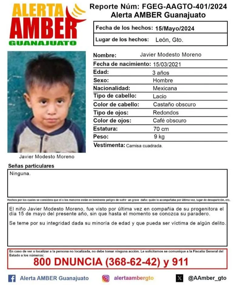 La denuncia por la desaparición de Javier ante la Fiscalía se realizó el jueves 16 de mayo con apoyo de personal de la SEMIG y fue hasta ese día en la noche cuando se emitió la alerta Ámber y la ficha de búsqueda.